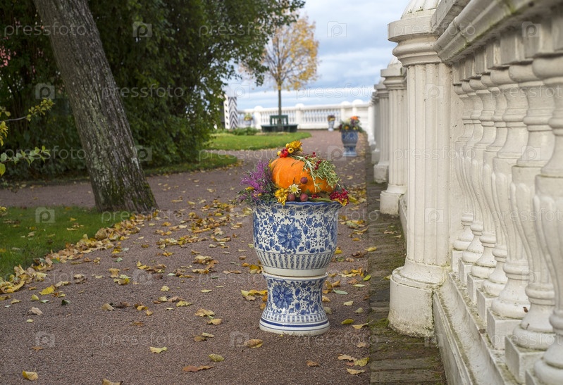 Вид на Петергофскую Военную гавань (Морская пристань «Петергоф») с террасы дворца Монплезир (Петергоф, Санкт-Петербург) осенью