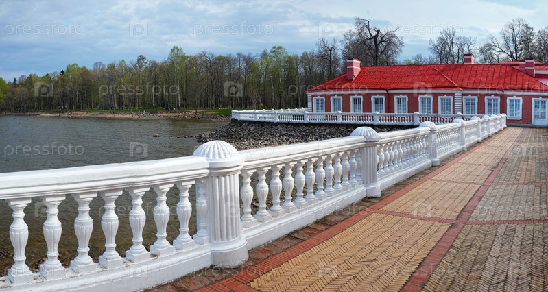 Нижний парк Петродворца: терраса и балюстрада Банного корпуса, дворец Монплезир (Петергоф, Санкт-Петербург) весной