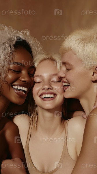 Портрет крупным планом трех молодых женщин, смеющихся. Сияющая кожа, естественная красота, разнообразие и связь, запечатленные в теплом и радостном выражении