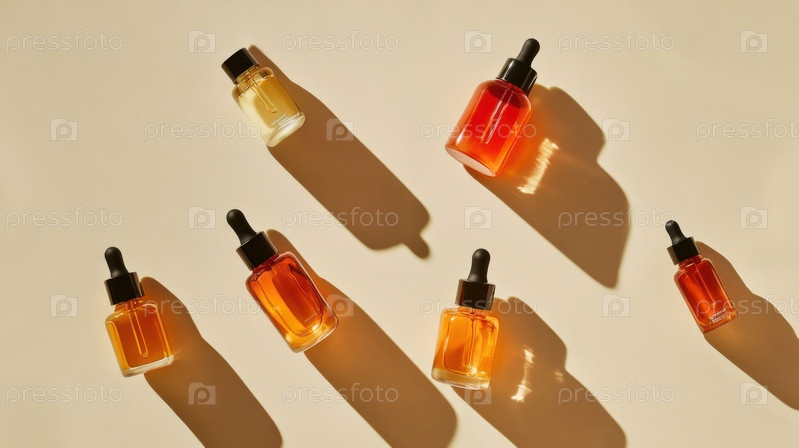Флаконы-капельницы янтарного цвета на бежевом фоне. Минималистская фотография средств по уходу за кожей и оздоровительных продуктов, демонстрирующая натуральные косметические масла и современный дизайн