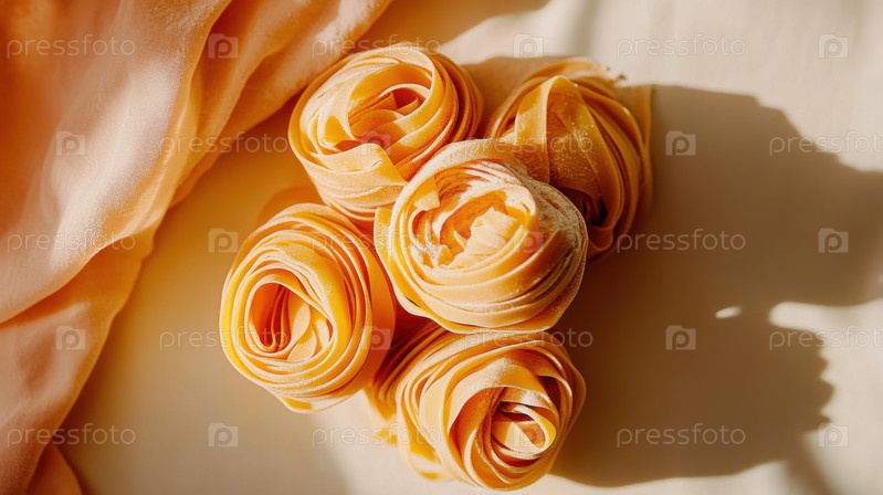 Крупный план гнезд из пасты тальятелле ручной работы, посыпанных мукой. Деревенские, традиционные итальянские кулинарные ингредиенты, выставленные в теплом естественном свете