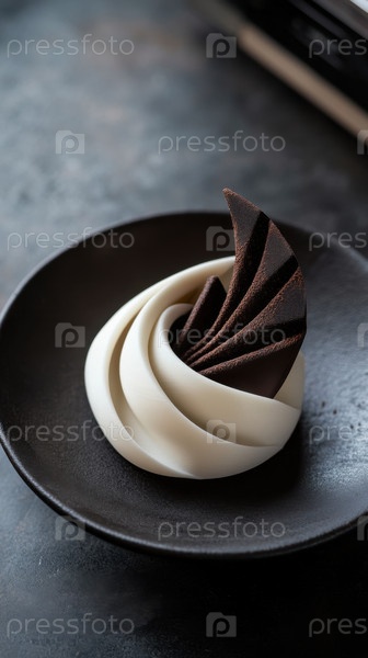 Минималистский шоколадный и ванильный спиральный десерт на черной тарелке. Элегантная презентация для гурманов с современным дизайном, плавными изгибами и художественной сервировкой