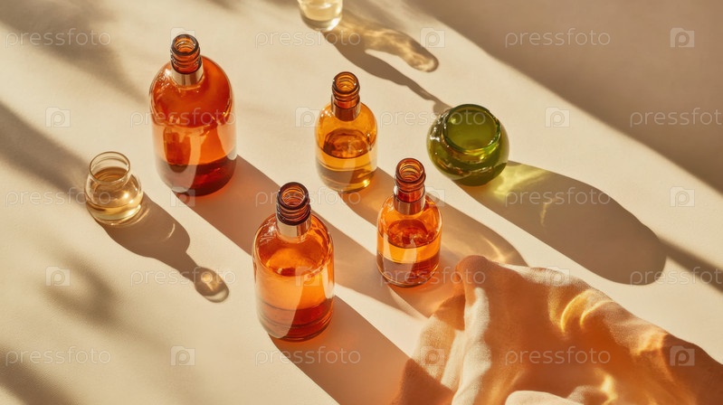 Минималистская композиция из стеклянных флаконов янтарного цвета, отбрасывающих длинные тени, с натуральными маслами и экологичной упаковкой средств по уходу за кожей в теплых солнечных лучах