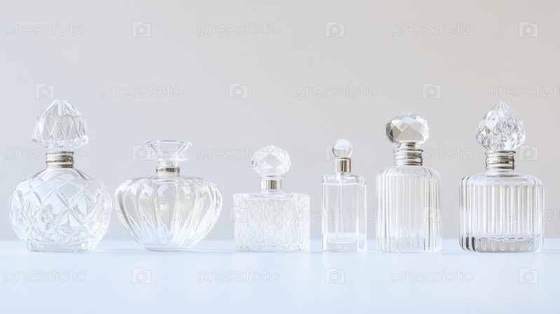 Элегантная коллекция винтажных хрустальных флаконов для духов, представленных на минимальном фоне. Прозрачный стеклянный дизайн подчеркивает роскошь, красоту и изысканность