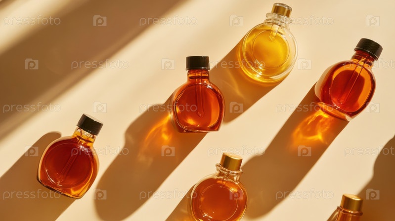 Минималистская плоская раскладка янтарных стеклянных флаконов-капельниц на солнце. Идеально подходит для органического ухода за кожей, травяных эссенций, оздоровительных, косметических и ароматерапевтических продуктов