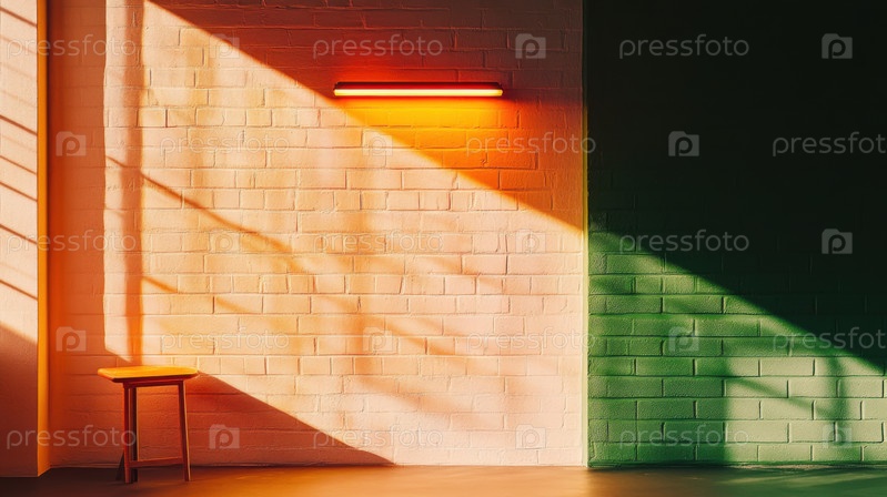 Стильная внутренняя стена с яркими оранжевыми и зелеными цветовыми блоками, естественным освещением и минималистичным деревянным табуретом. Современное пространство, сочетающее геометрический дизайн и баланс