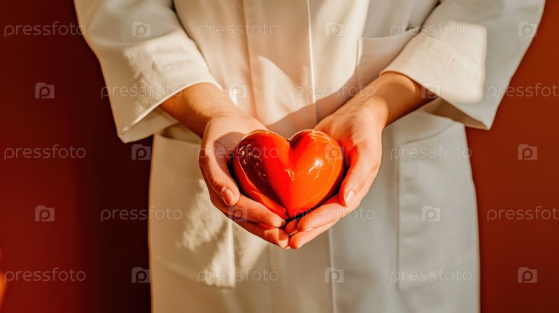 Врач в белой форме нежно держит красное сердце. Медицинская помощь и сострадание олицетворяют здоровье, поддержку, профилактику и гуманитарную службу