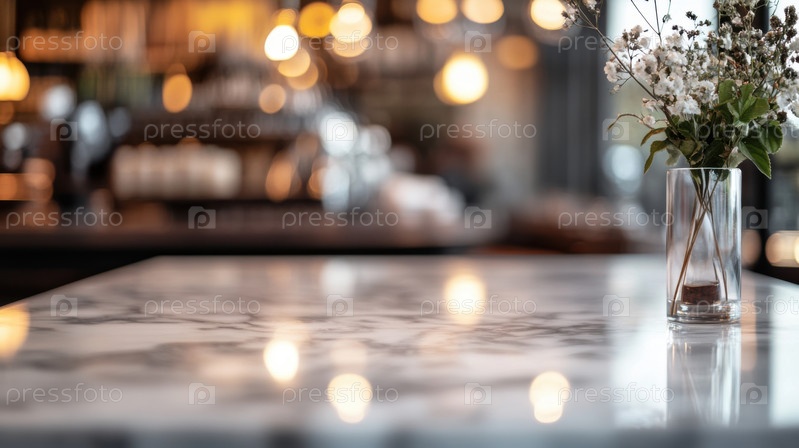 Элегантная мраморная столешница в уютном кафе. Нежный букет в стеклянной вазе дополняет мягкое боке, добавляя очарования минималистичному интерьеру столовой