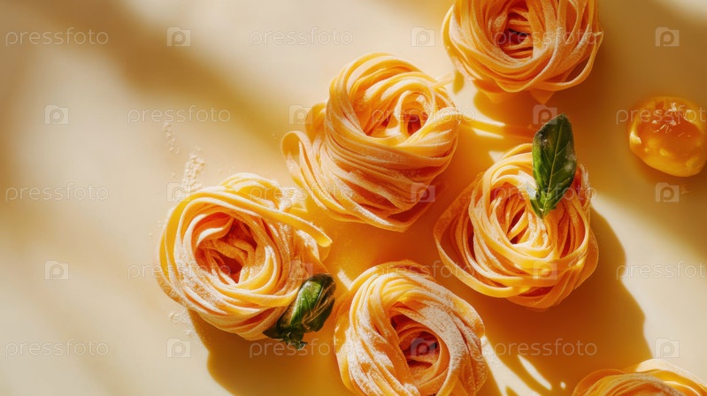 Крупный план гнезд из пасты тальятелле ручной работы на желтой поверхности, посыпанной мукой и украшенной листьями базилика, демонстрирующей итальянскую кулинарную традицию