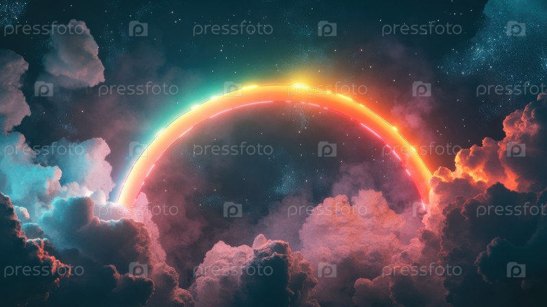Сюрреалистическое ночное небо со светящейся неоновой радужной дугой, светящимися облаками и звездным космическим фоном, создающее мечтательную футуристическую небесную фантастическую сцену