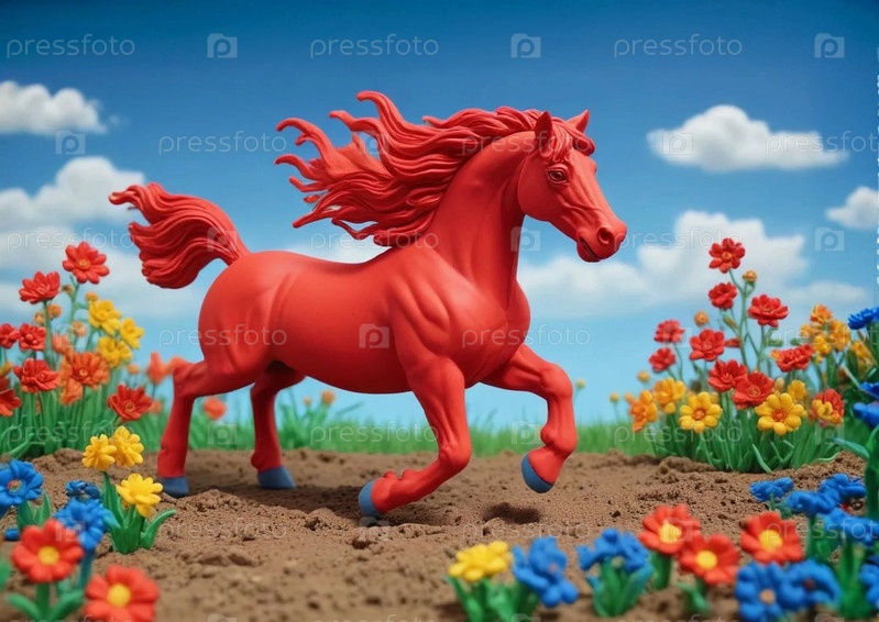 Красная огненная лошадь бежит в поле с цветами