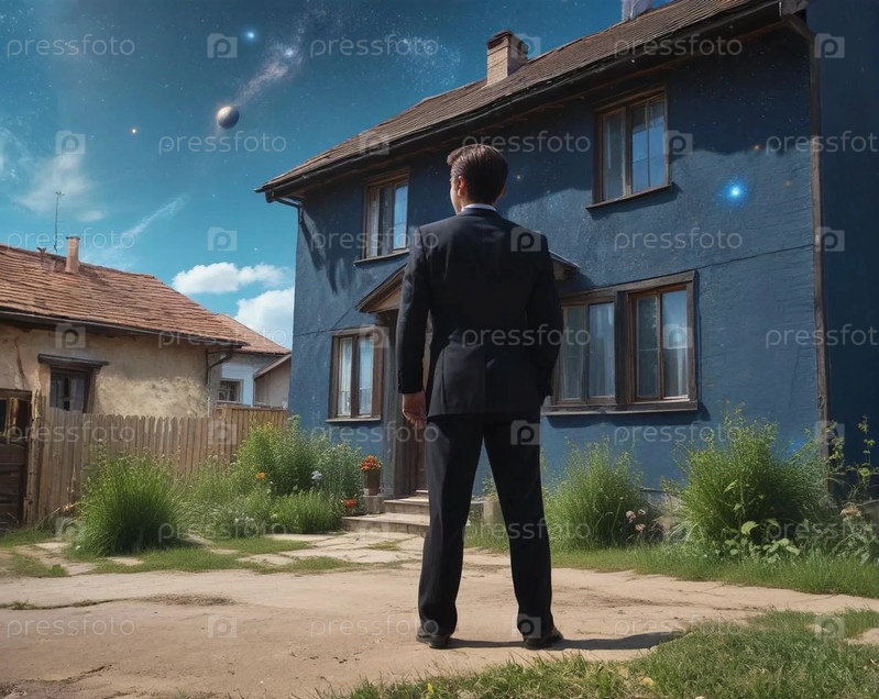 мужчина в костюме стоит у дома в деревне