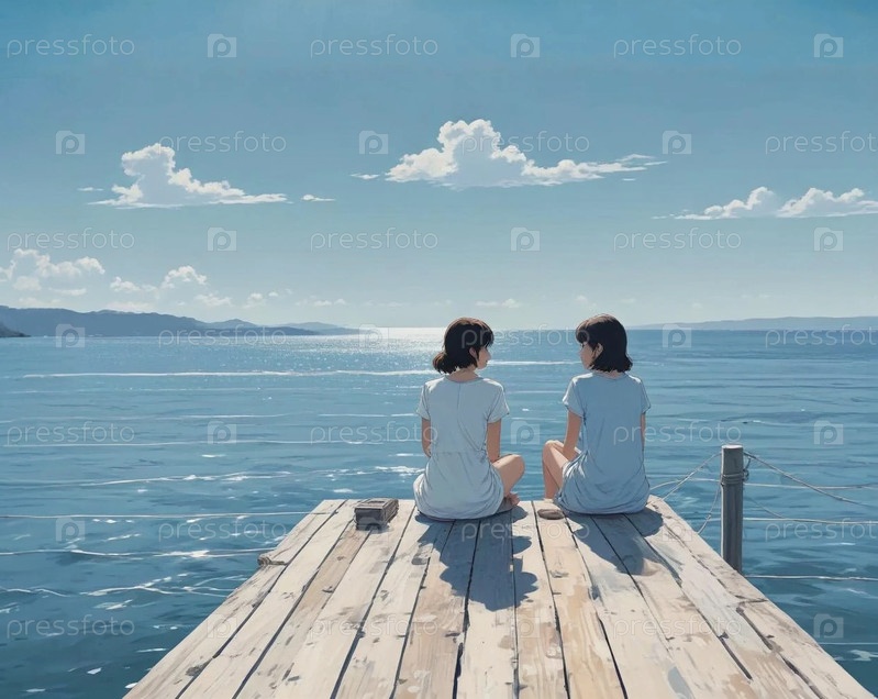 Две девушки сидят на причале у моря и разговаривают
