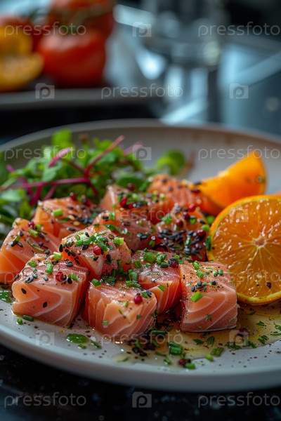 Гурманская тарелка со свежим сашими из тунца, украшенная яркими травами и дольками апельсина. Идеально подходит для кулинарных блогов и продвижения здорового питания
