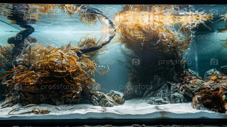 Древние водоросли процветают в современном аквариуме, демонстрируя доисторическую морскую экосистему с яркими водорослями и водными растениями в естественной подводной среде
