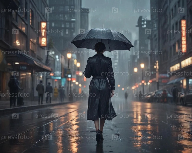 Грустная женщина на улице в дождь держит зонт у фонаря