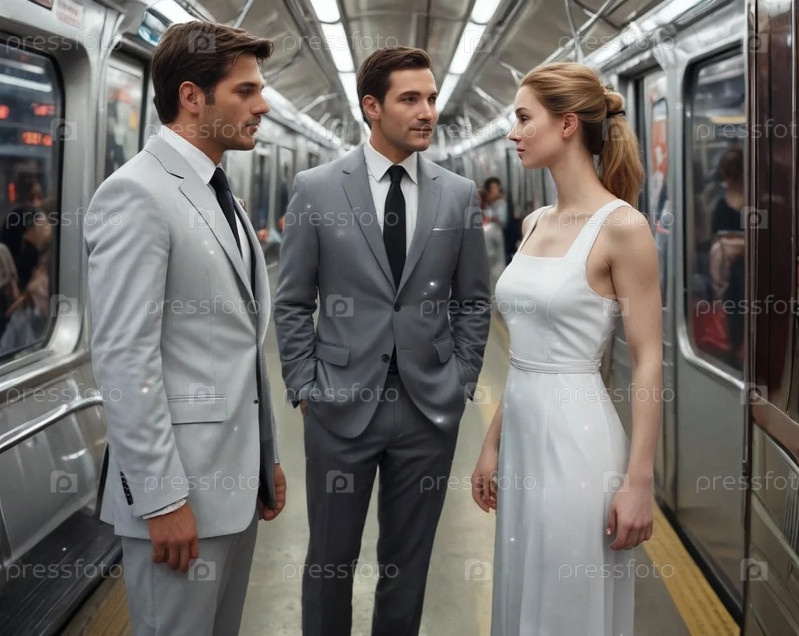 Два мужчины в костюмах и женщина в платье разговаривают в метро