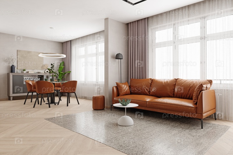 Гостиная с коричневым диваном и обеденной зоной, деревянные полы