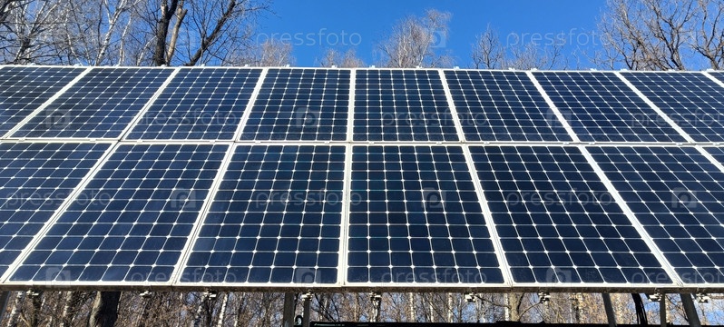 В лесном месте солнечные панели возвышаются на фоне ясного голубого неба, улавливая солнечный свет для производства энергии. Сцена подчеркивает чистые технологии и экологическую устойчивость