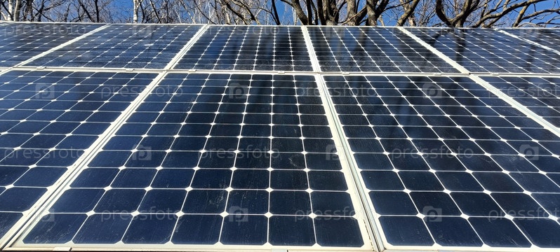 Солнечные панели установлены в естественной среде, демонстрируя технологию, разработанную для использования солнечной энергии под ярким голубым небом в солнечный день