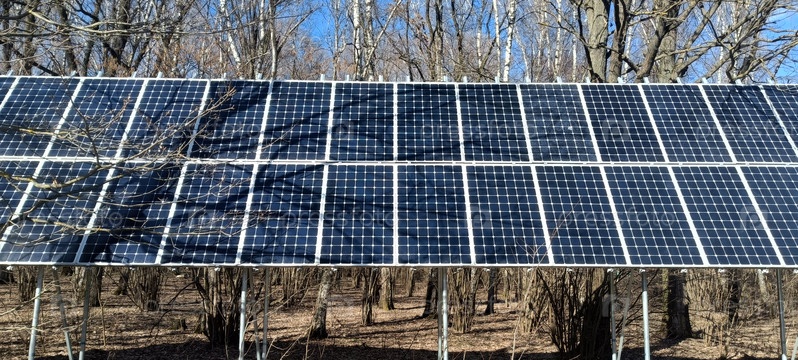 Ряд солнечных панелей стоит среди высоких деревьев в лесу, улавливая солнечный свет для генерации возобновляемой энергии. Чистое голубое небо подчеркивает естественную красоту сцены