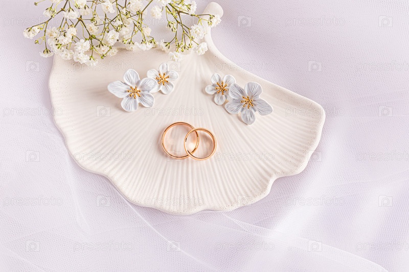 Нежная красивая свадебная композиция с золотыми кольцами, серьгами на шикарном подносе и белыми цветами. Вид сверху. Фон из белого тюля
