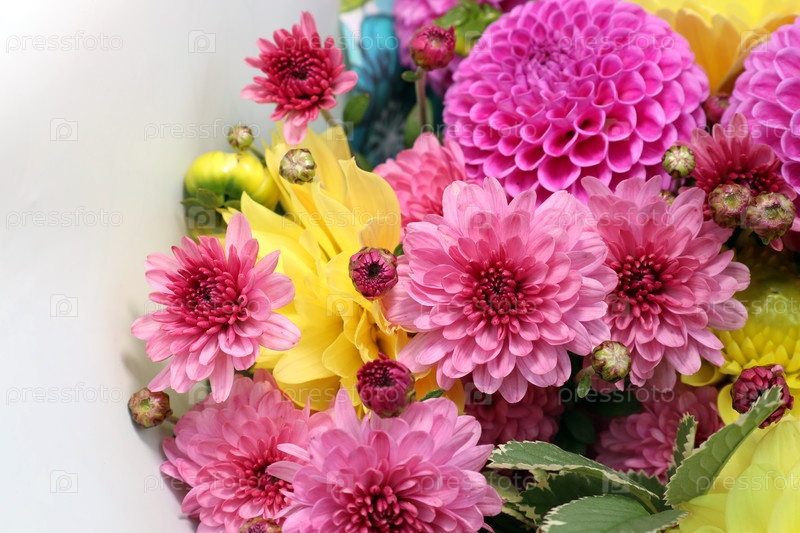 Яркий букет из хризантем и помпонных георгинов, выращенных в собственном саду