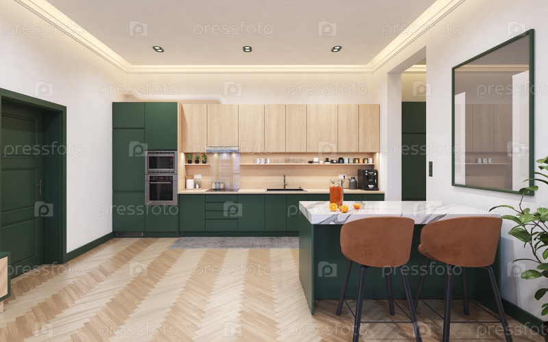 Современная открытая кухня и гостиная, уютные, стильные, зеленые шкафы. 3d рендер