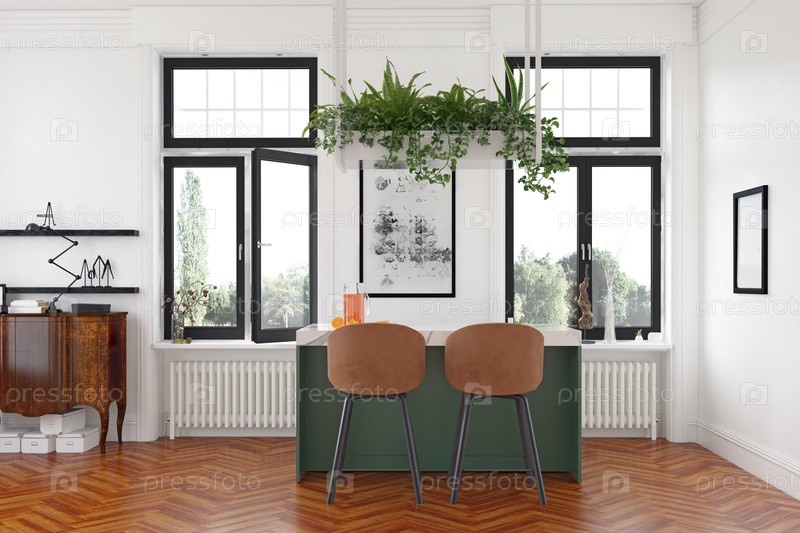Уютная гостиная с коричневым диваном, белыми стенами и большими окнами. 3D-рендеринг