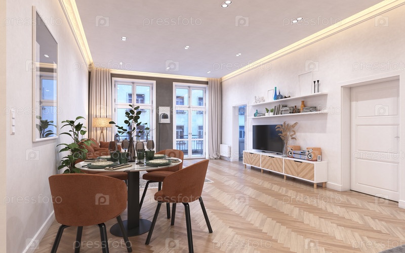 Гостиная с оранжевым диваном, обеденной зоной и растениями