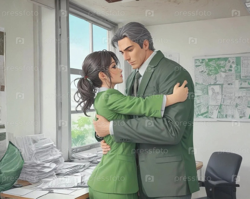 мужчина и женщина в зеленых костюмах обнимаются в офисе