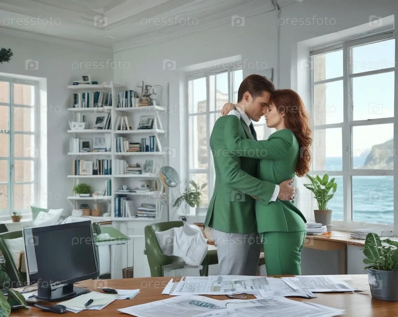 мужчина и женщина в зеленых костюмах обнимаются в офисе