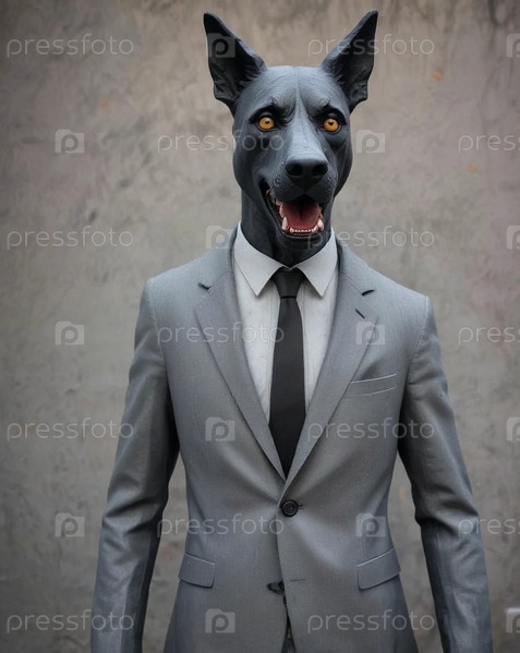 злой мужчина в сером костюме с головой собаки