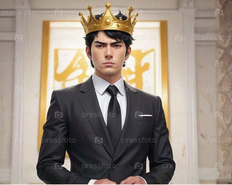 мужчина брюнет в черном костюме в короне гордый серьезный