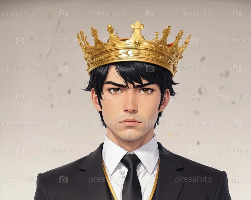 мужчина брюнет в черном костюме в короне гордый серьезный