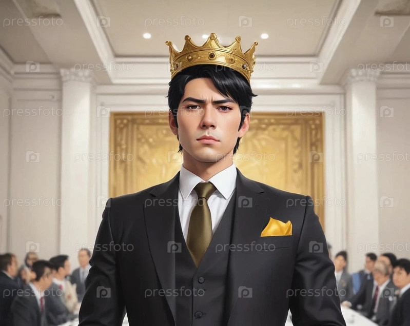 мужчина брюнет в черном костюме в короне гордый серьезный