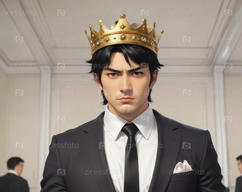 Мужчина брюнет в черном костюме в короне гордый серьезный