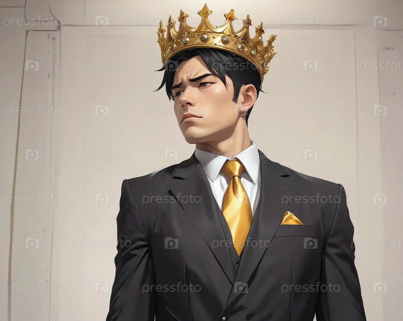 Мужчина брюнет в черном костюме в короне гордый серьезный