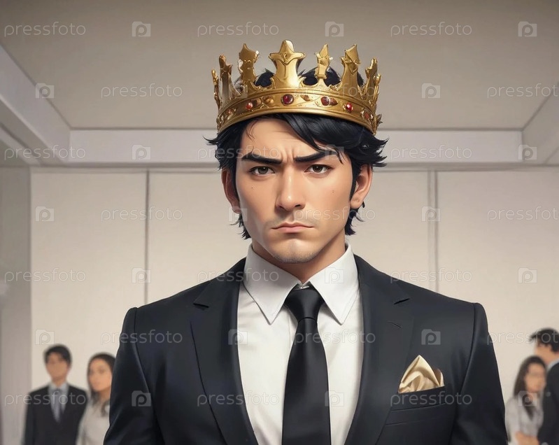 Мужчина брюнет в черном костюме в короне гордый серьезный