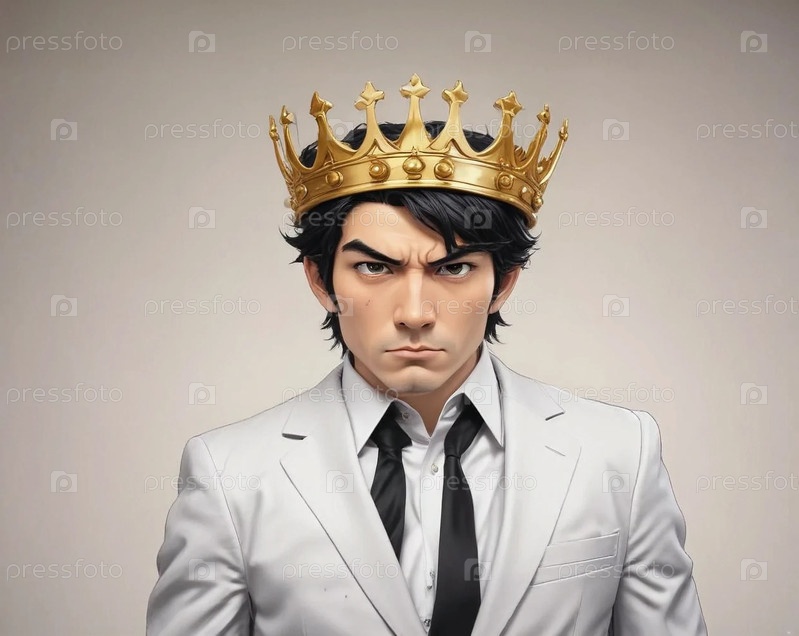 Мужчина брюнет в черном костюме в короне гордый серьезный