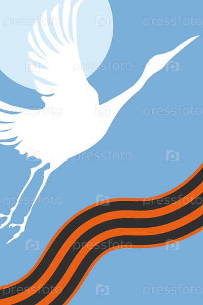 Векторный рисунок. Белый журавль в синем небе и георгиевская лента