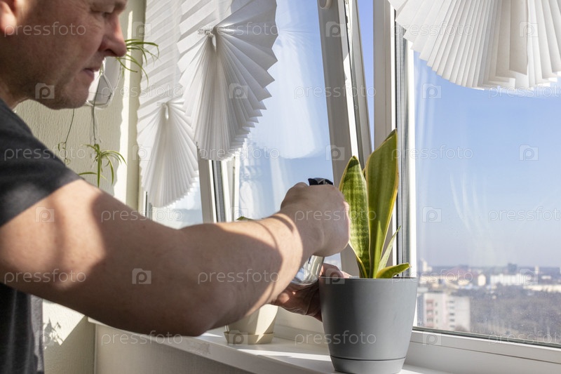 Мужчина опрыскивает комнатные растения на подоконнике. Интерьер