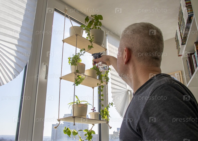 Мужчина опрыскивает комнатные растения на подоконнике на декоративной полке. Интерьер