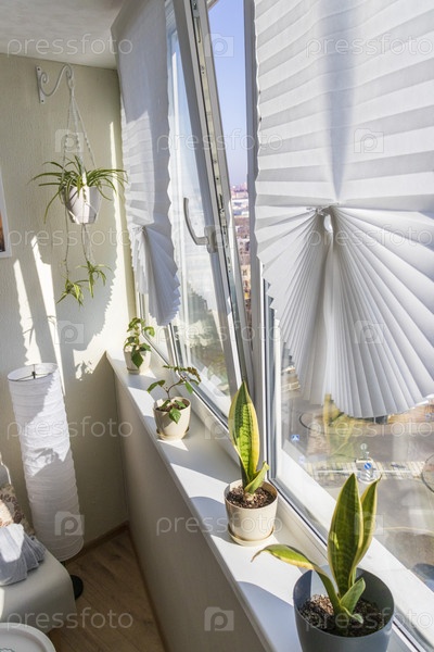 Различные комнатные растения на подоконнике в квартире. Интерьер