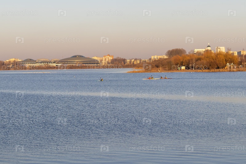 Группа людей, занимающихся каякингом на открытой воде. Спорт