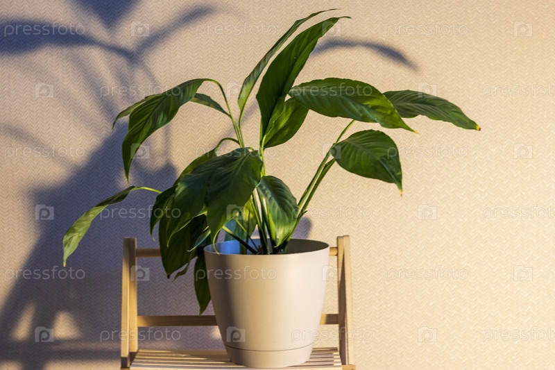 Комнатное растение на декоративной полке, отбрасывающее тень на стену позади. Концепция