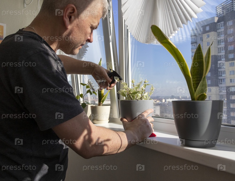 Мужчина опрыскивает комнатные растения на подоконнике. Интерьер