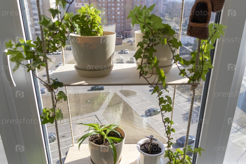 Различные комнатные растения на подоконнике в квартире. Интерьер