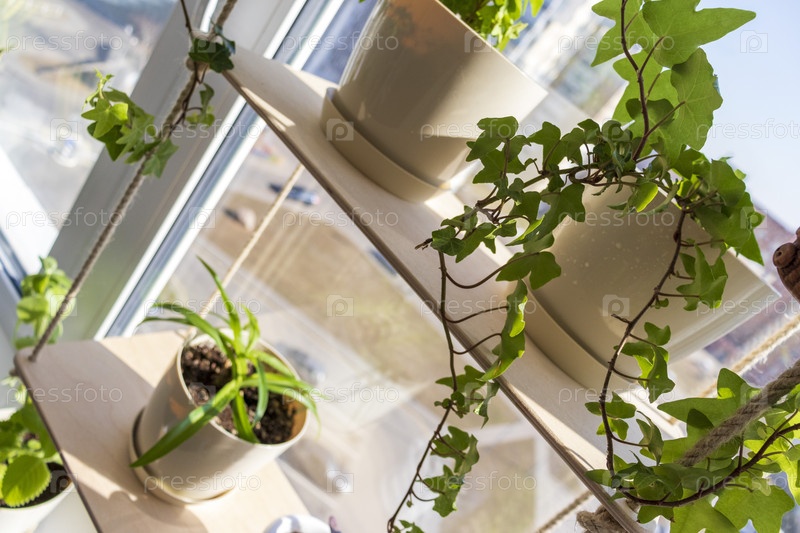 Различные комнатные растения на подоконнике в квартире. Интерьер
