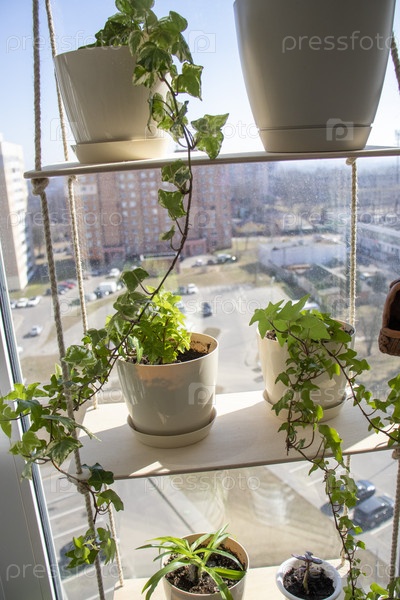 Различные комнатные растения на подоконнике в квартире. Интерьер